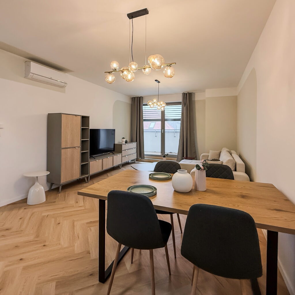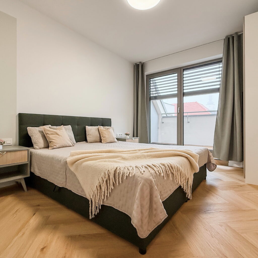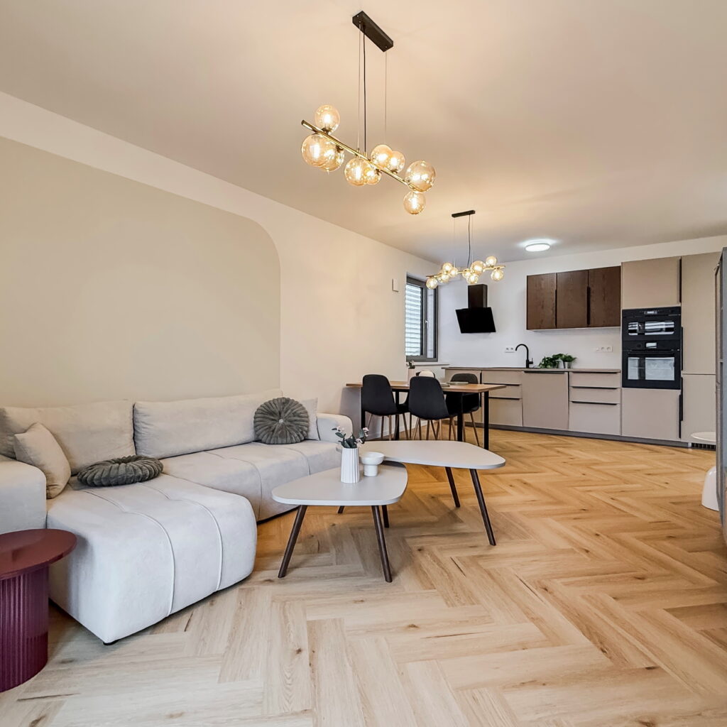 Dominantou bytu je priestranná obývacia izba prepojená s kuchyňou a jedálňou, s nadčasovým nábytkom a modernými líniami. Atmosféru bývania dopĺňa elegantná spálňa s kvalitnou posteľou a výstupom na balkón.