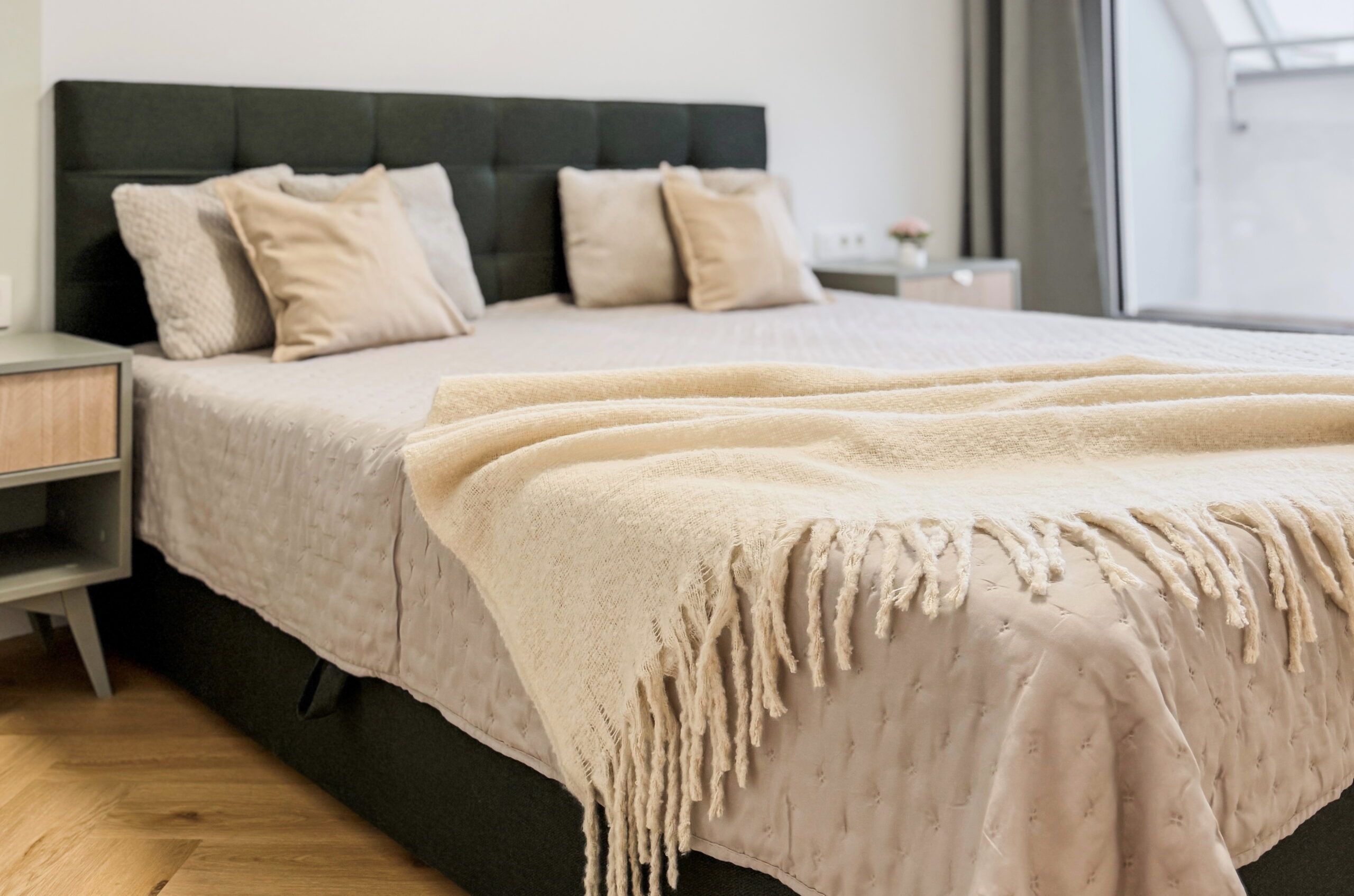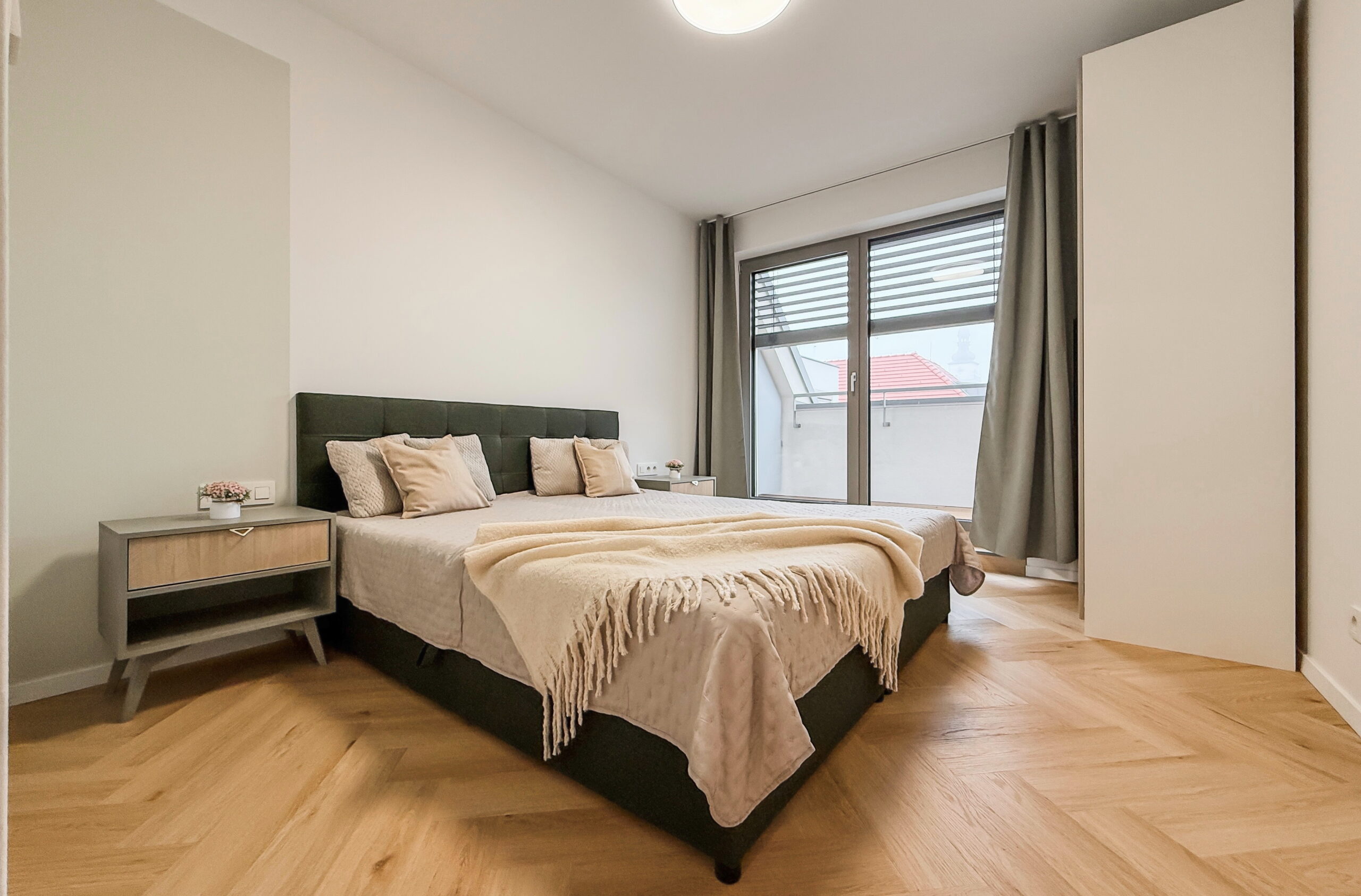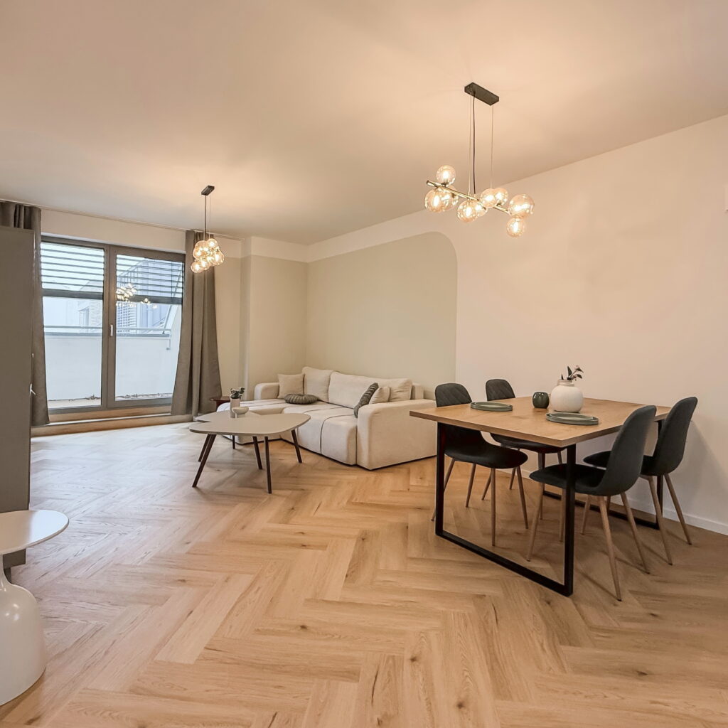 Dominantou bytu je priestranná obývacia izba prepojená s kuchyňou a jedálňou, s nadčasovým nábytkom a modernými líniami. Atmosféru bývania dopĺňa elegantná spálňa s kvalitnou posteľou a výstupom na balkón.
