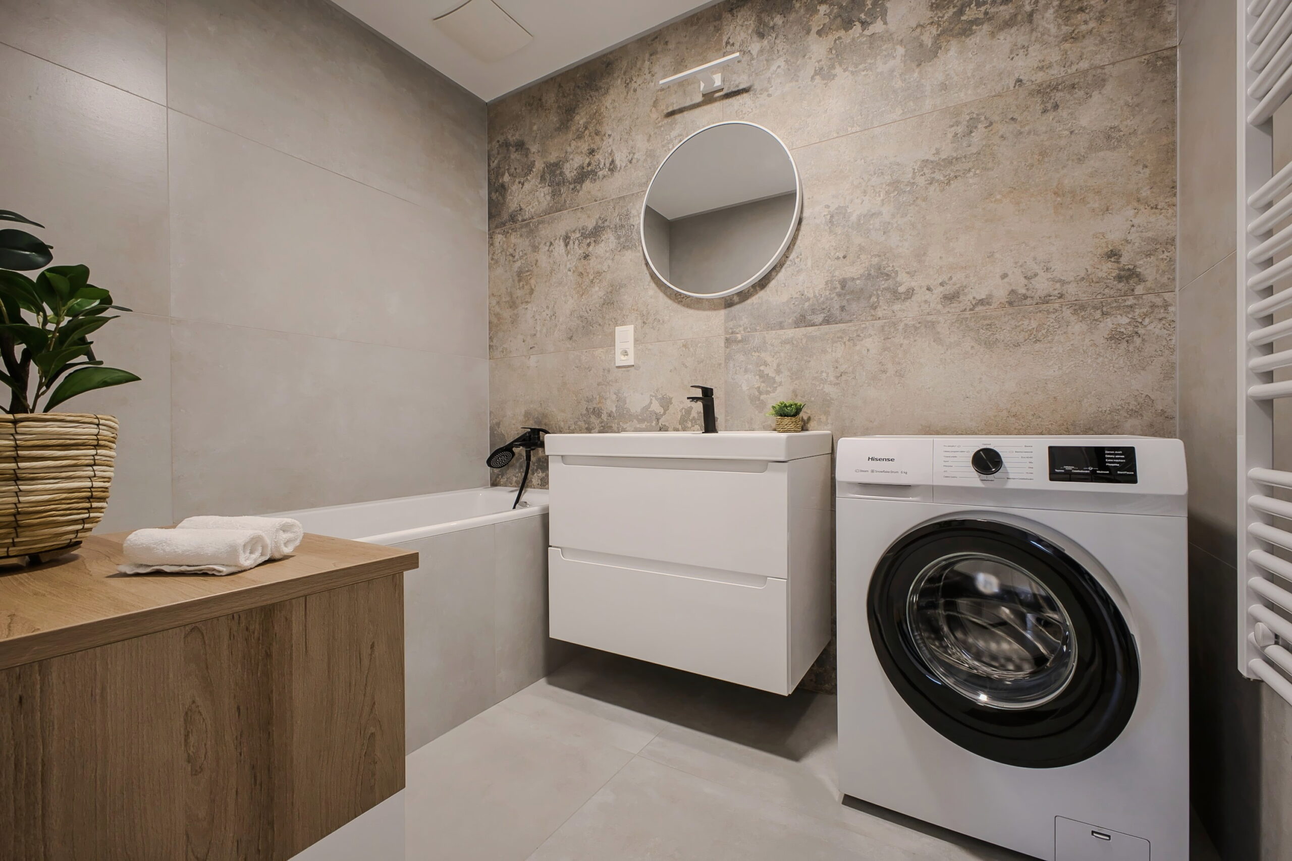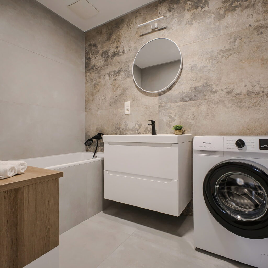 Kúpeľňa je priestranná a funkčne riešená, s vaňou ideálnou na relax a prakticky umiestnenou práčkou, ktorá nenarúša jej čistý vzhľad.