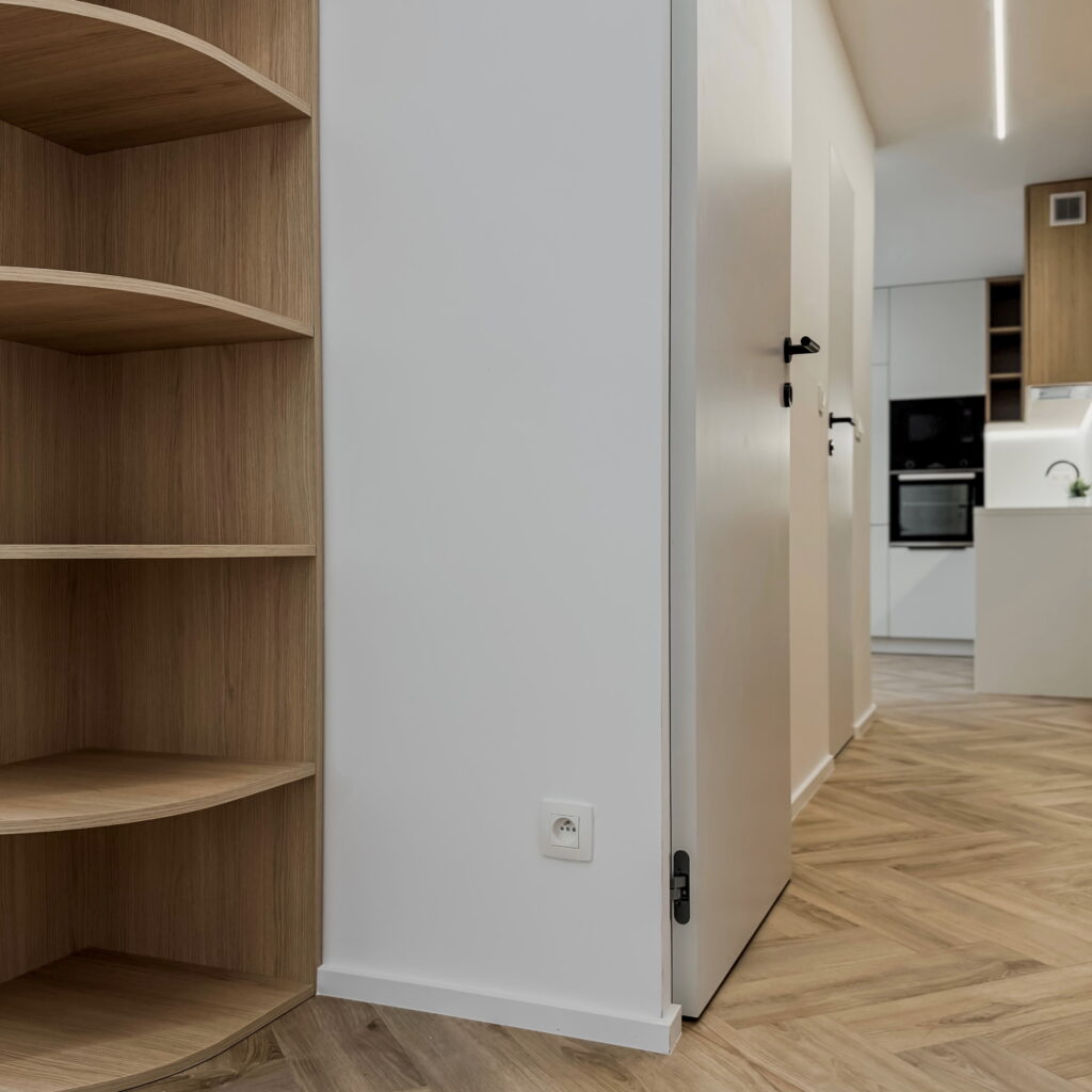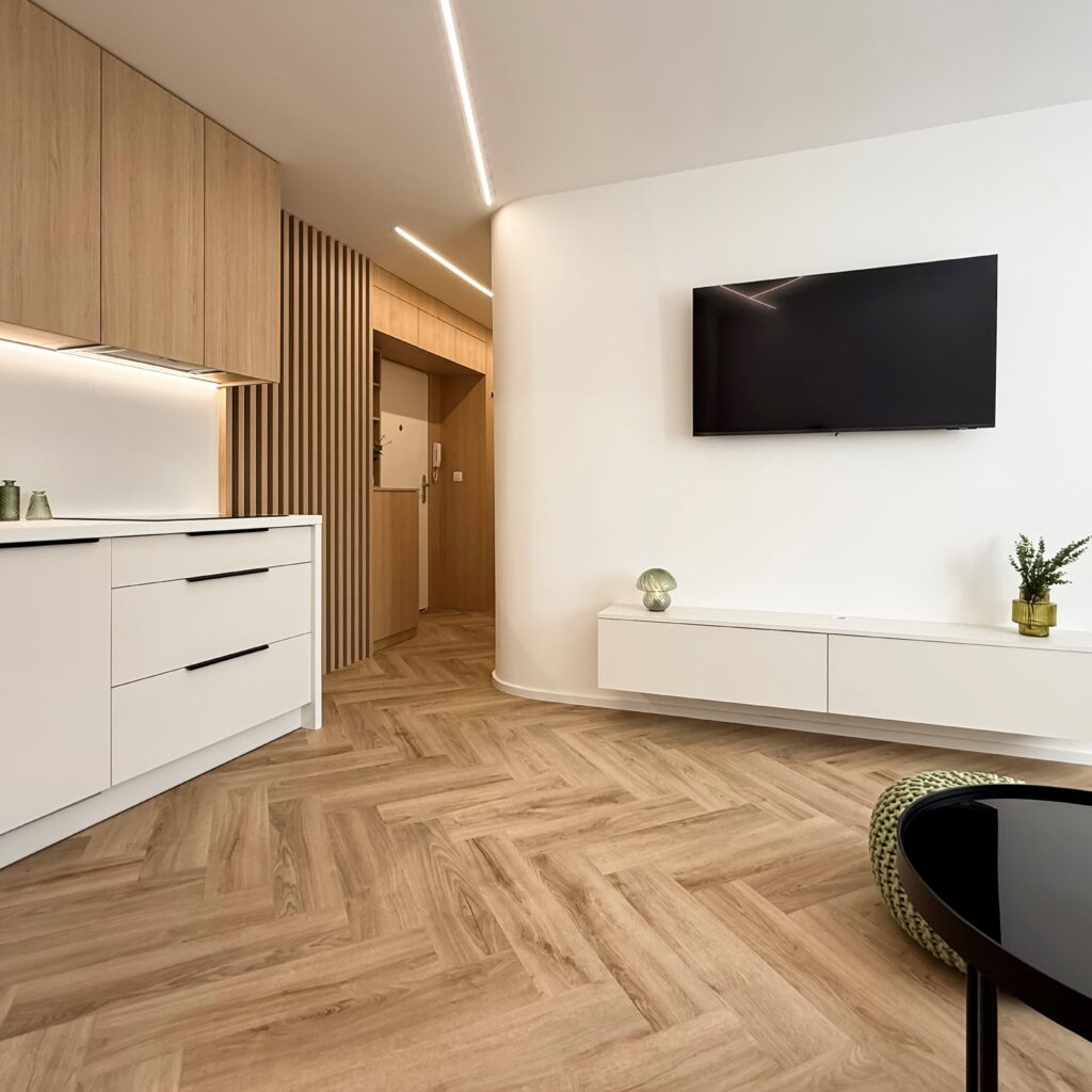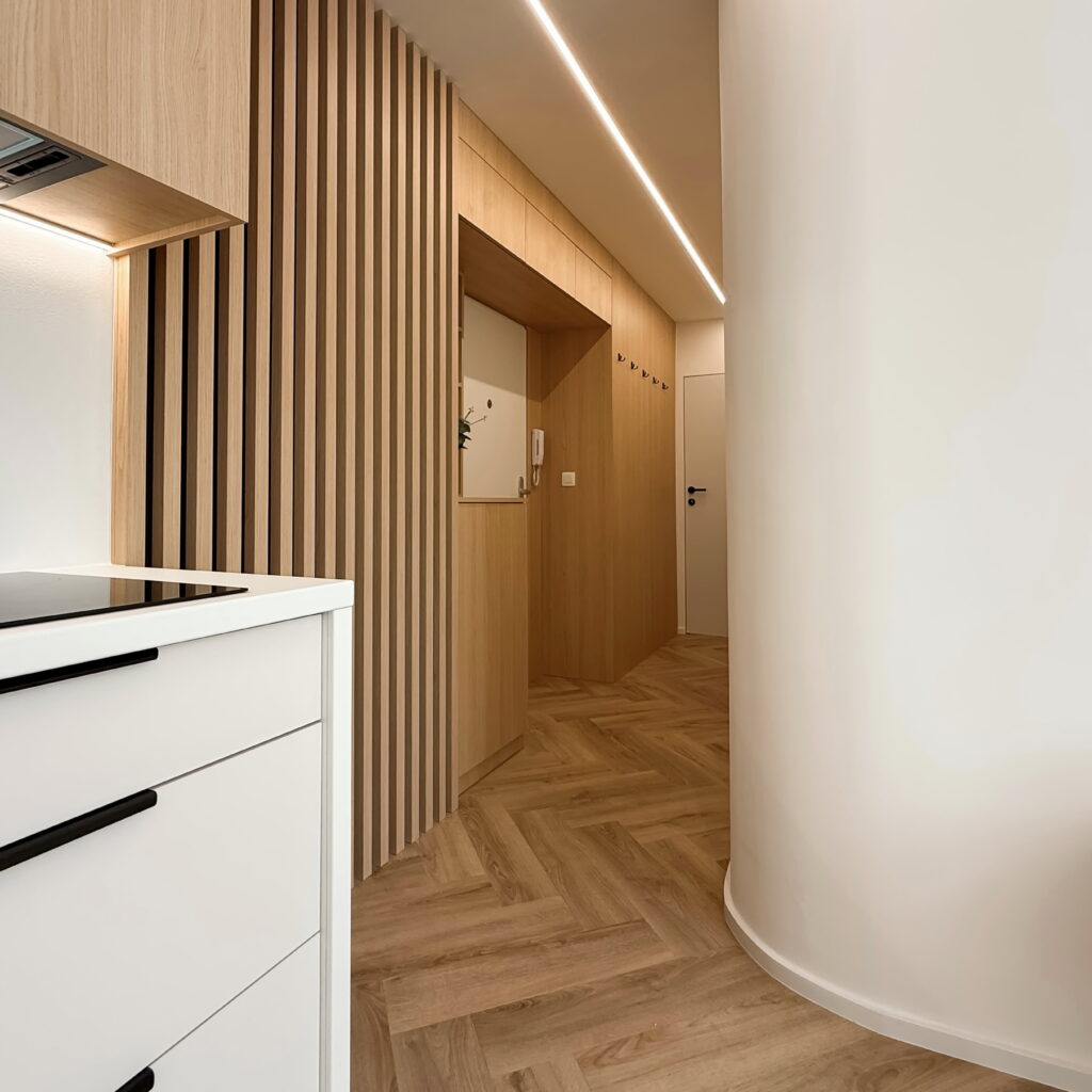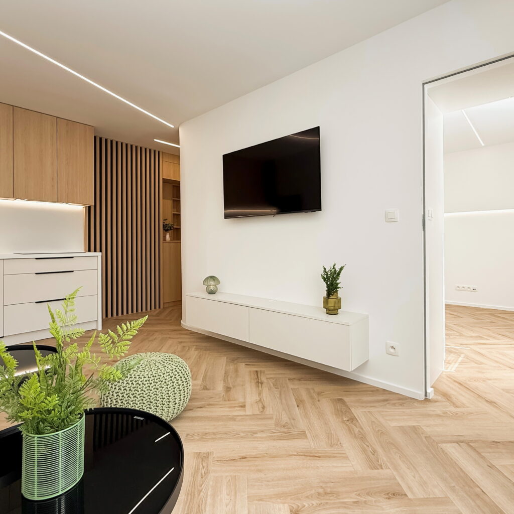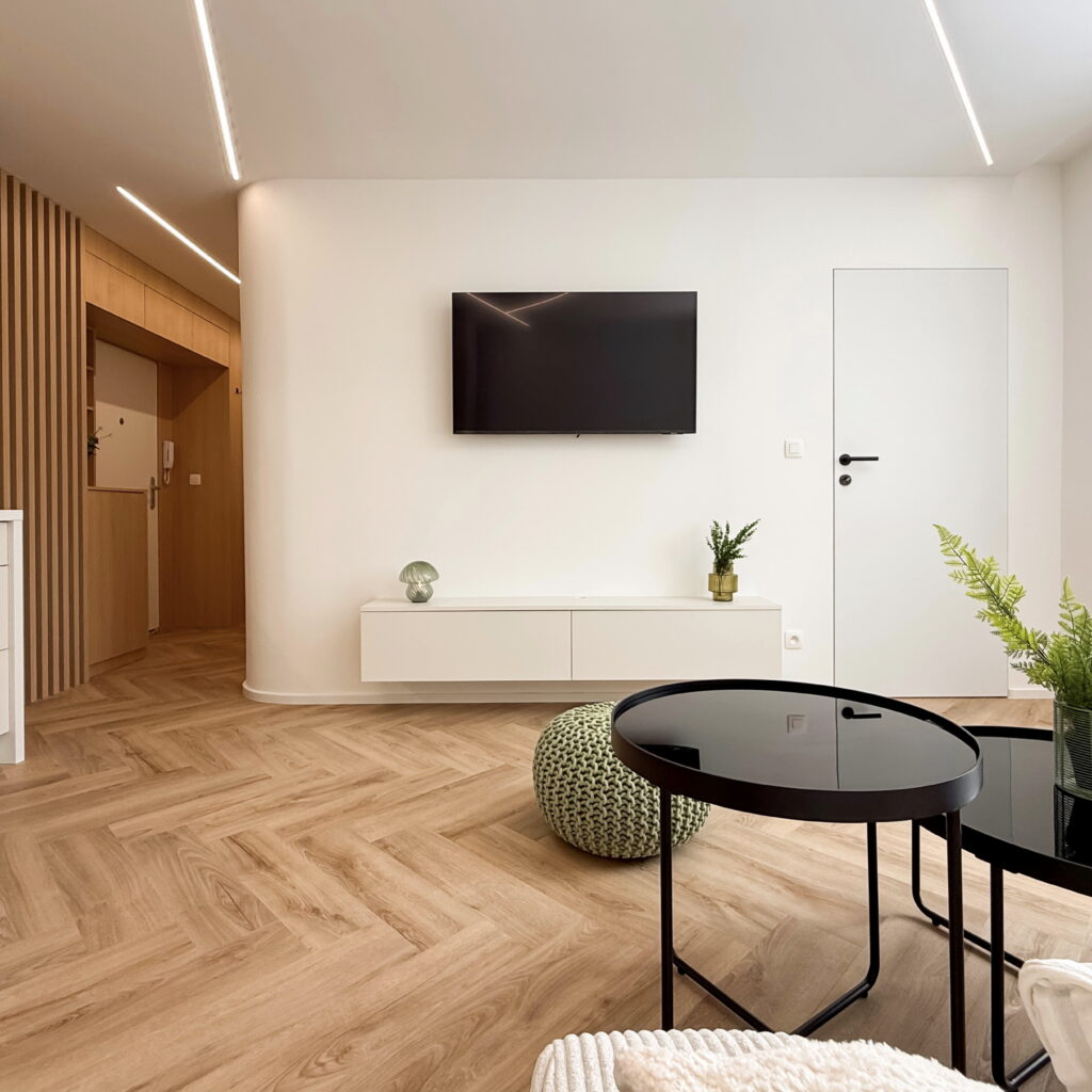 Vstúpte do interiéru, v ktorom sa estetika čistých línií spája s pocitom domova. Tento byt predstavuje dokonalú synergiu moderného minimalizmu a hrejivých prírodných materiálov, pričom každý prvok bol starostlivo vybraný s cieľom vytvoriť vizuálne vyvážený celok.