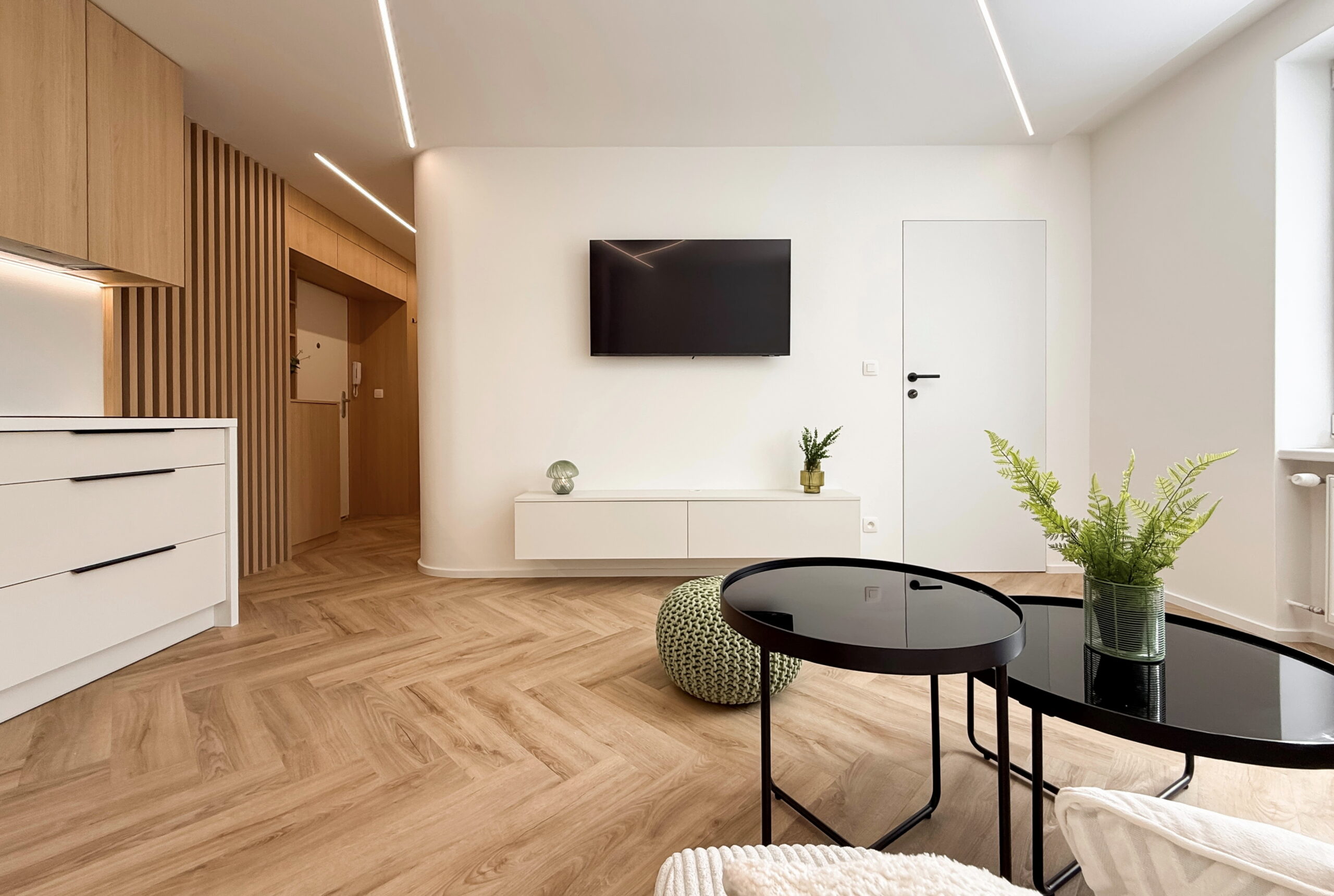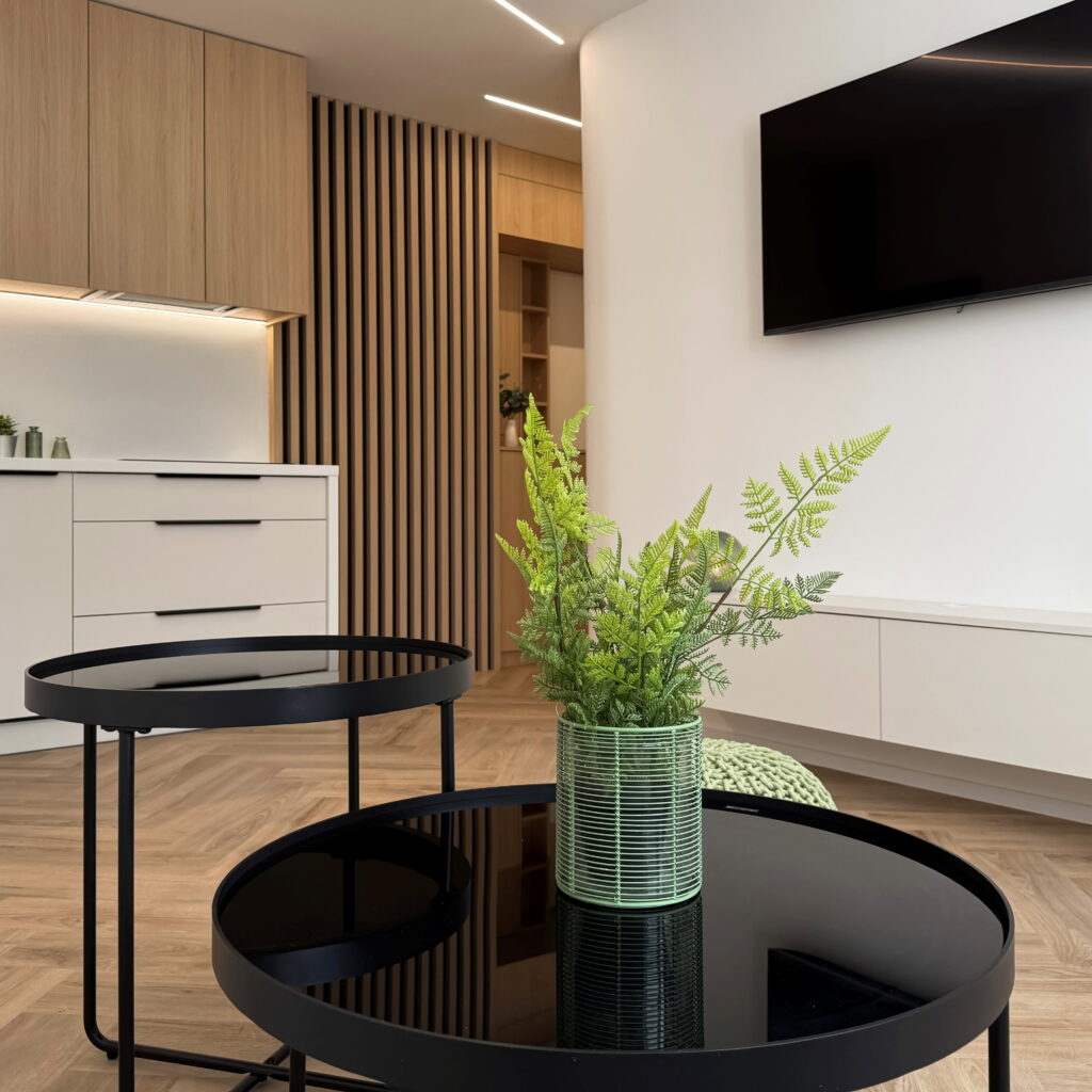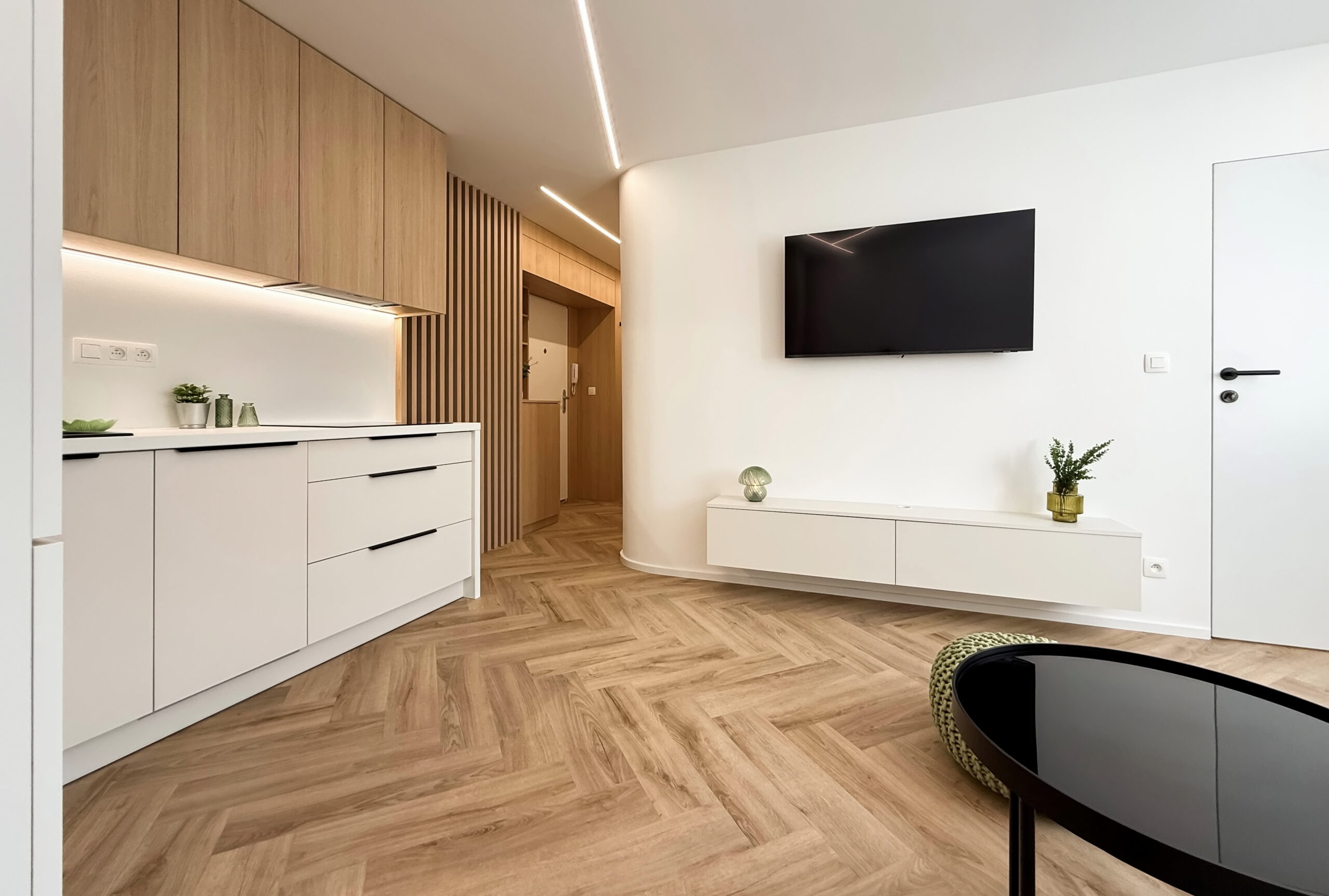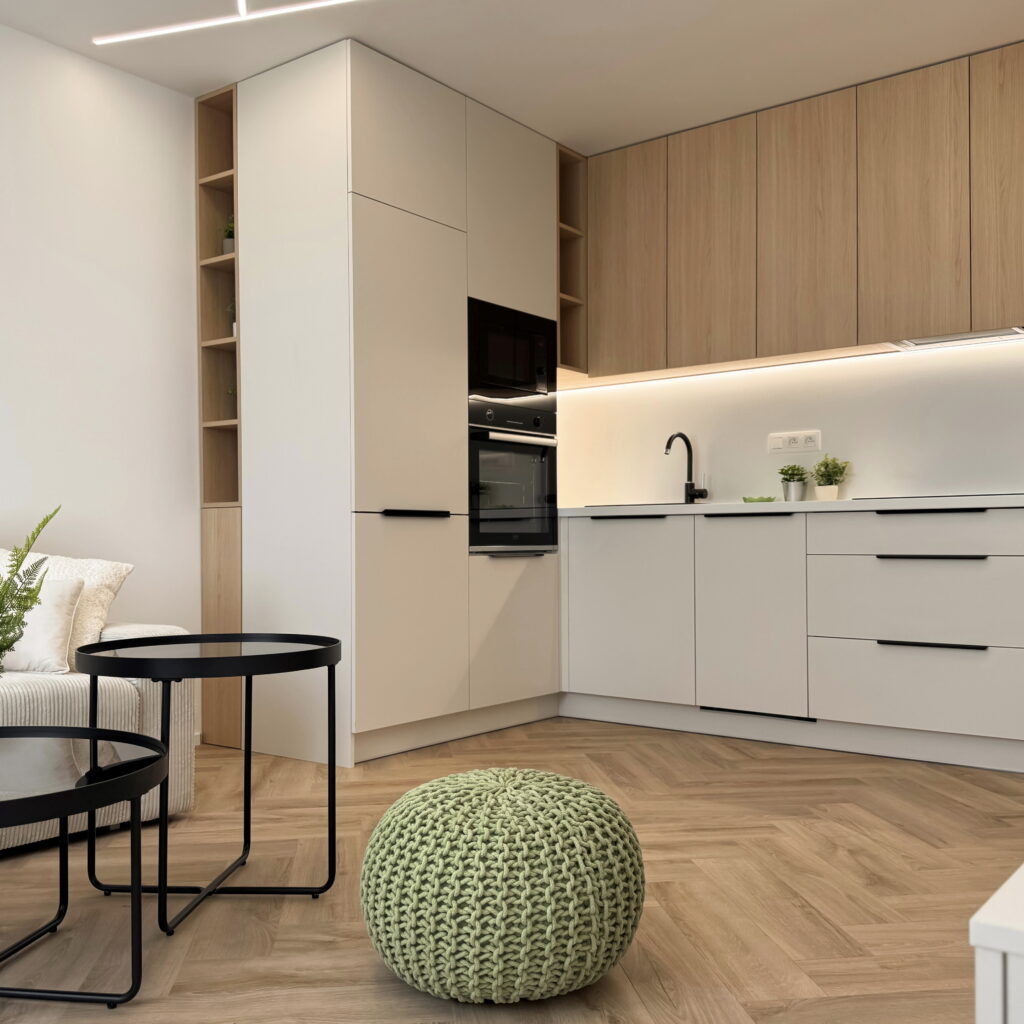 Vstúpte do interiéru, v ktorom sa estetika čistých línií spája s pocitom domova. Tento byt predstavuje dokonalú synergiu moderného minimalizmu a hrejivých prírodných materiálov, pričom každý prvok bol starostlivo vybraný s cieľom vytvoriť vizuálne vyvážený celok.