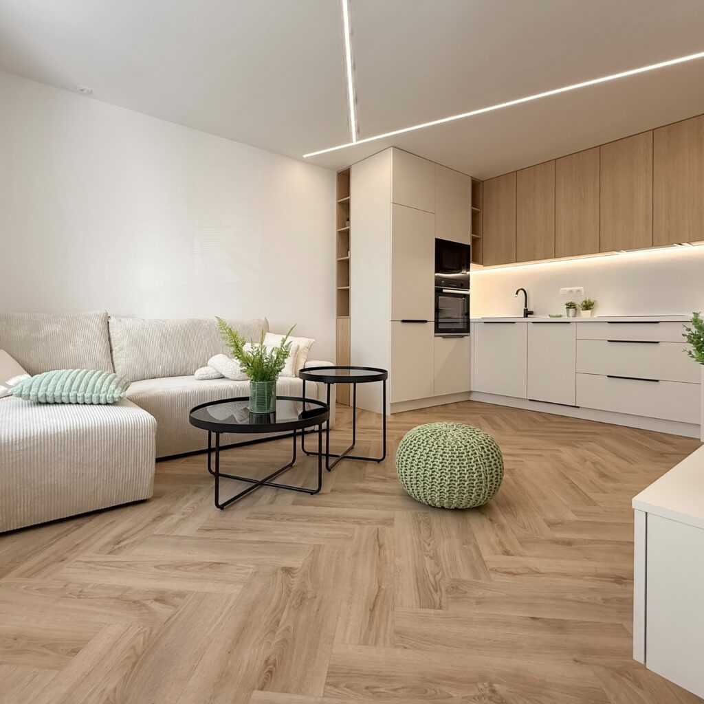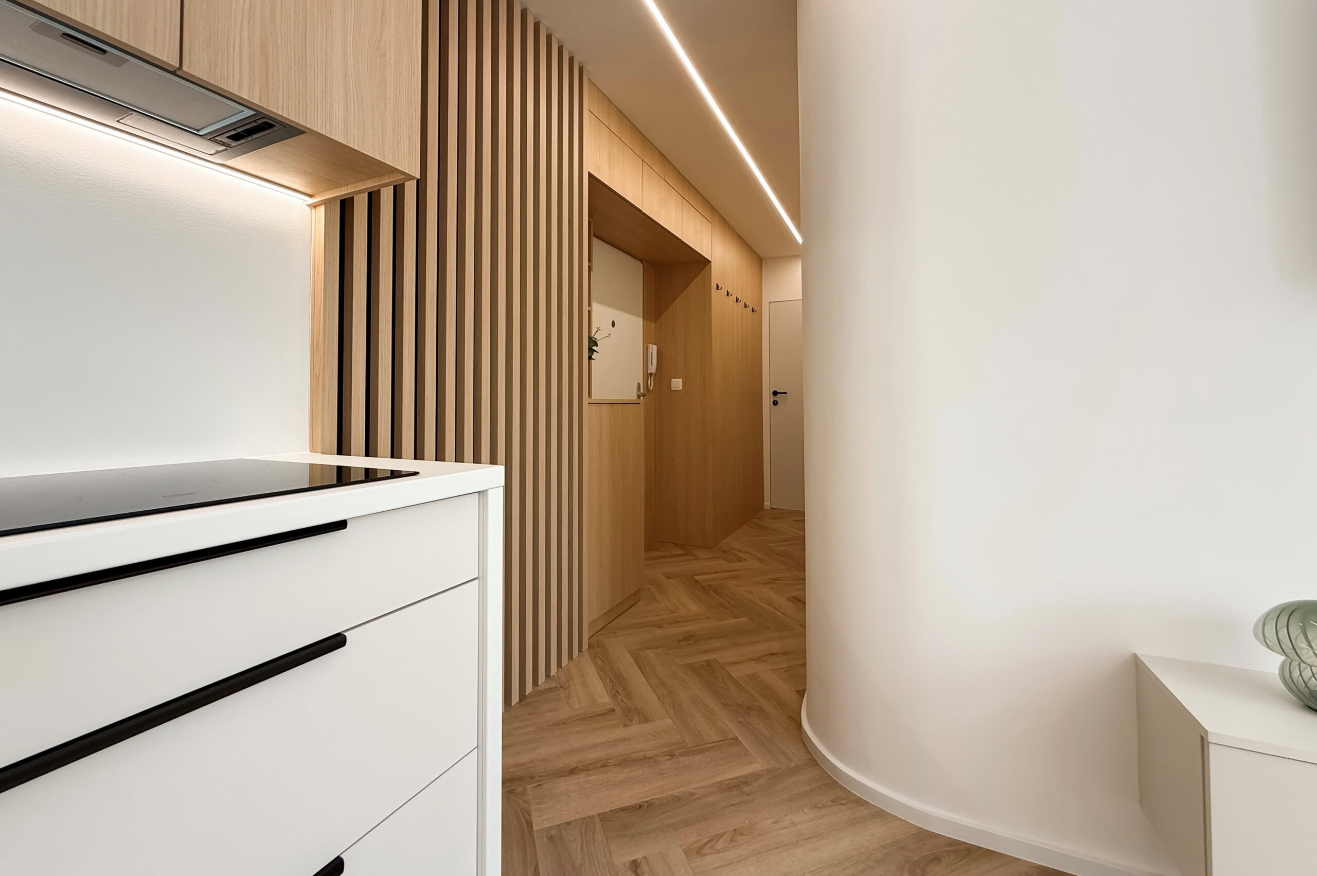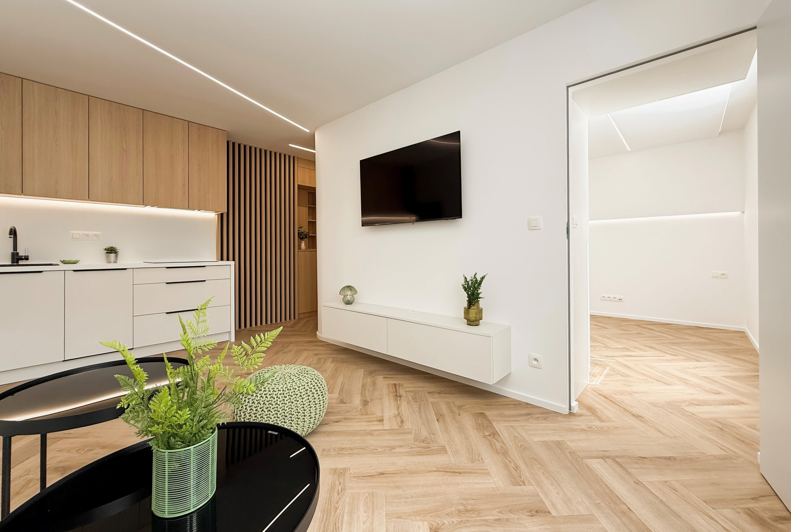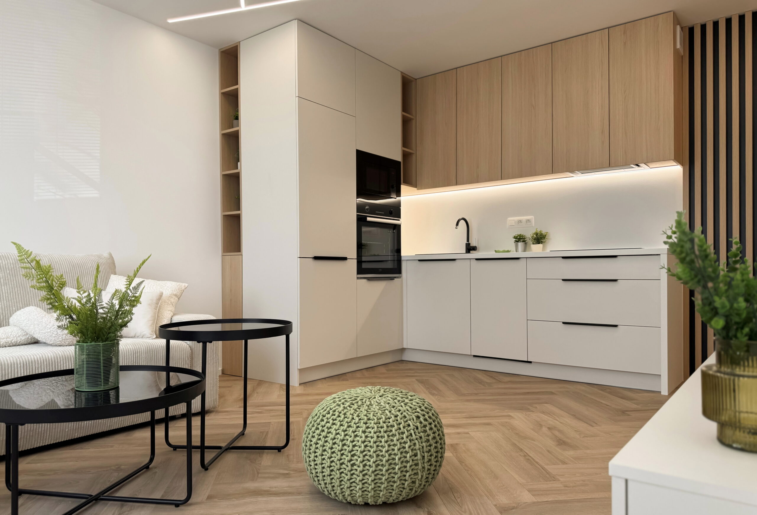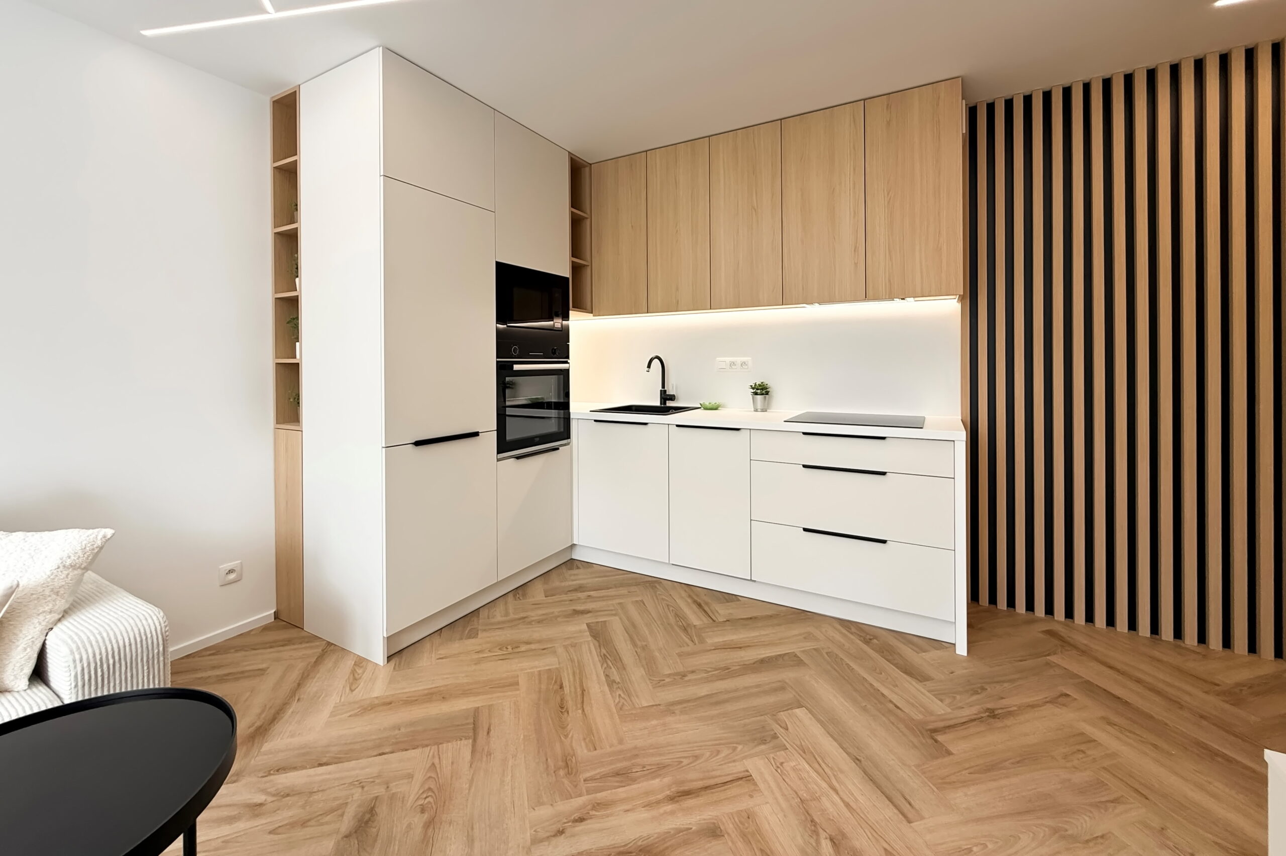 Dominantným prvkom obytného priestoru je kvalitná vinylová podlaha so vzorom rybej kosti, ktorá v celom priestore plynule nadväzuje na lamelové panely a nábytok vyrobený na mieru. Svetlo v tomto priestore neplní len praktickú funkciu, ale stáva sa kľúčovým architektonickým prvkom vďaka integrovaným LED líniám, ktoré jemne kopírujú dispozíciu a podčiarkujú dynamiku interiéru.