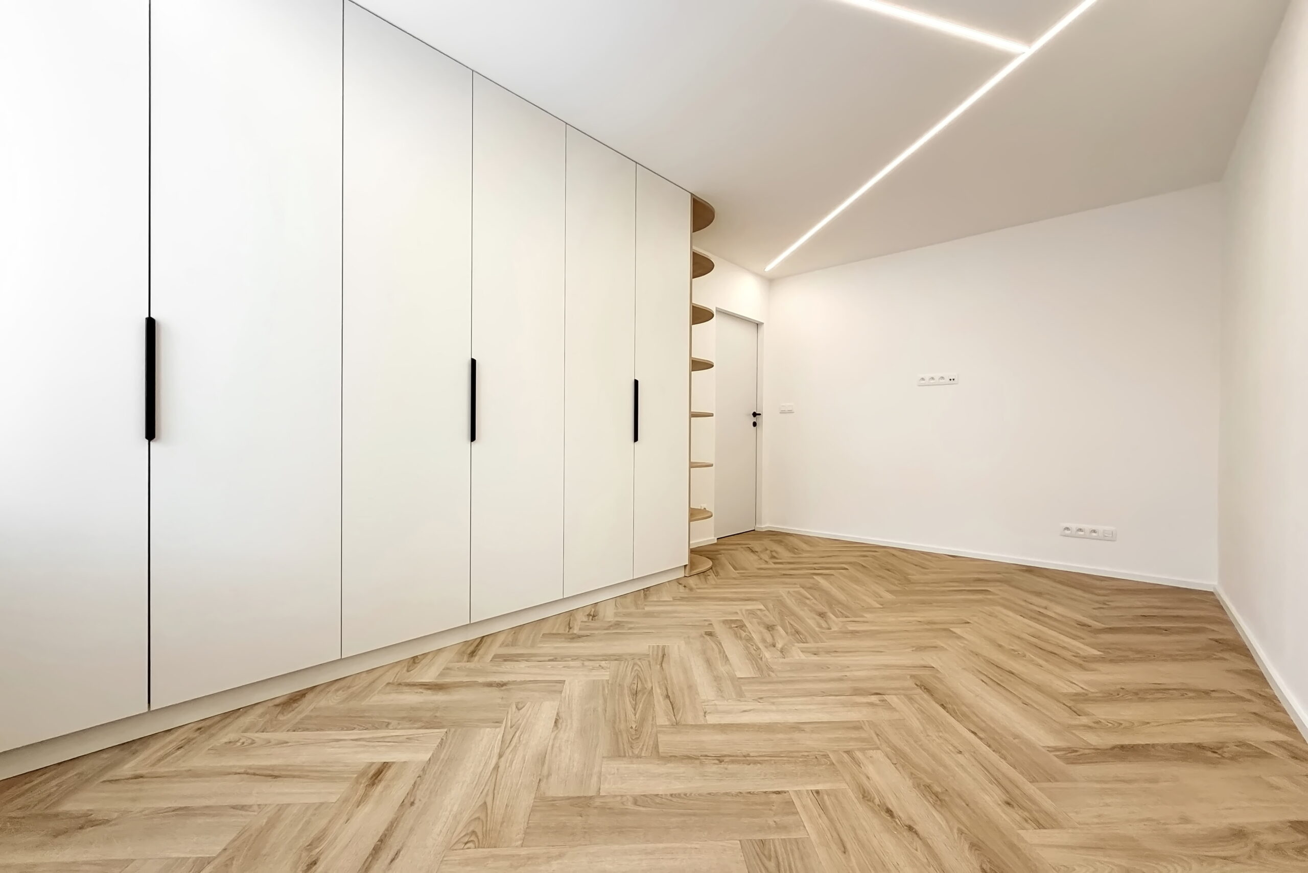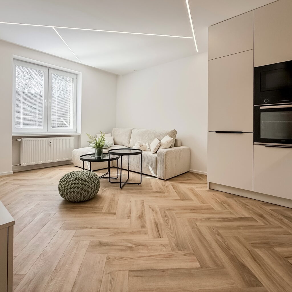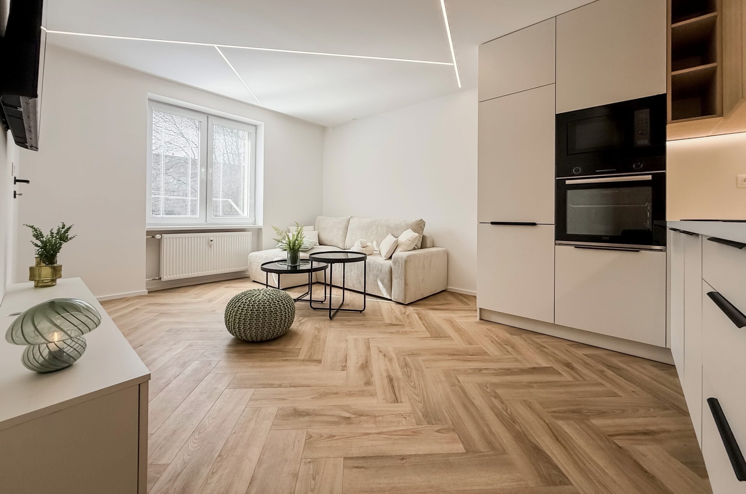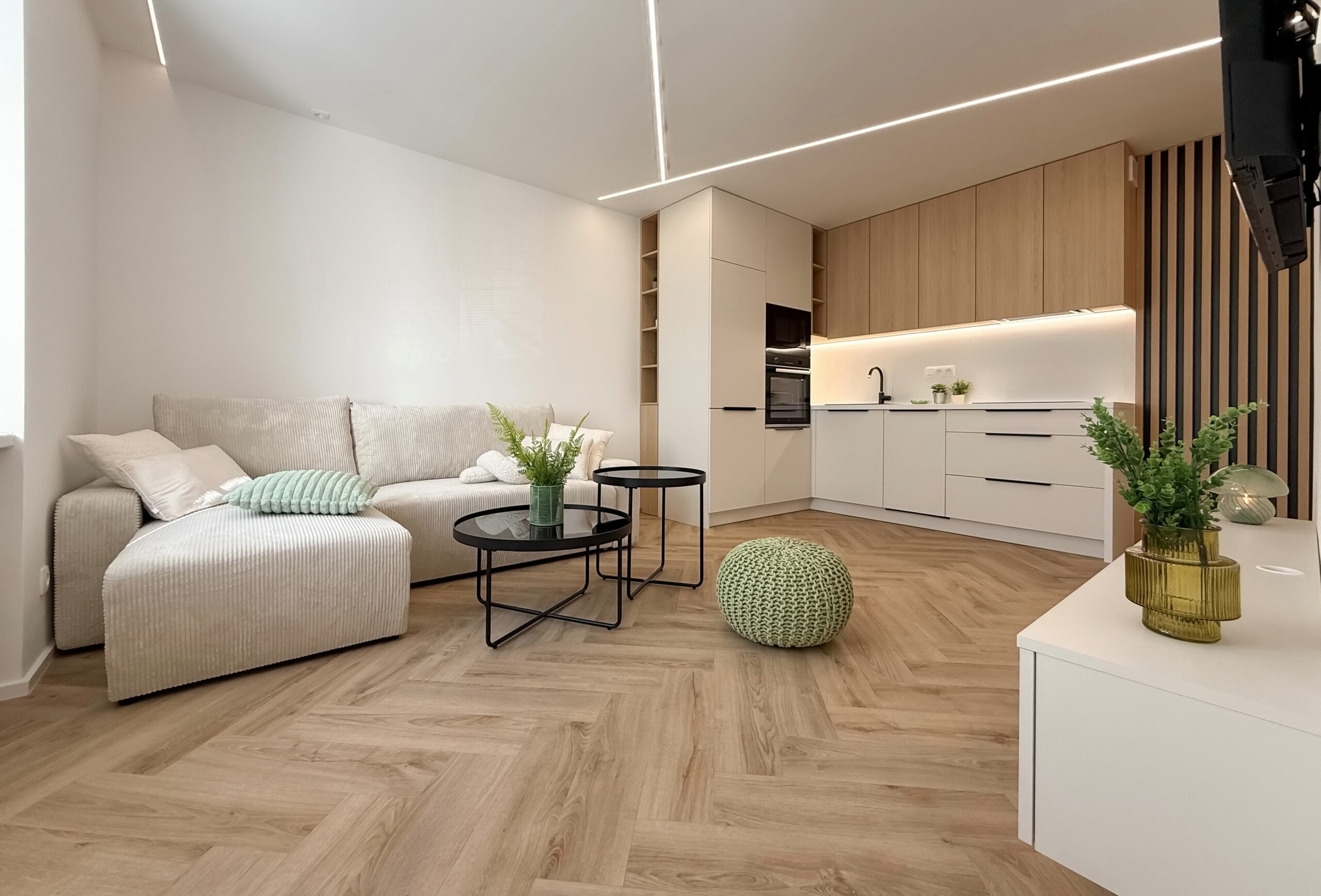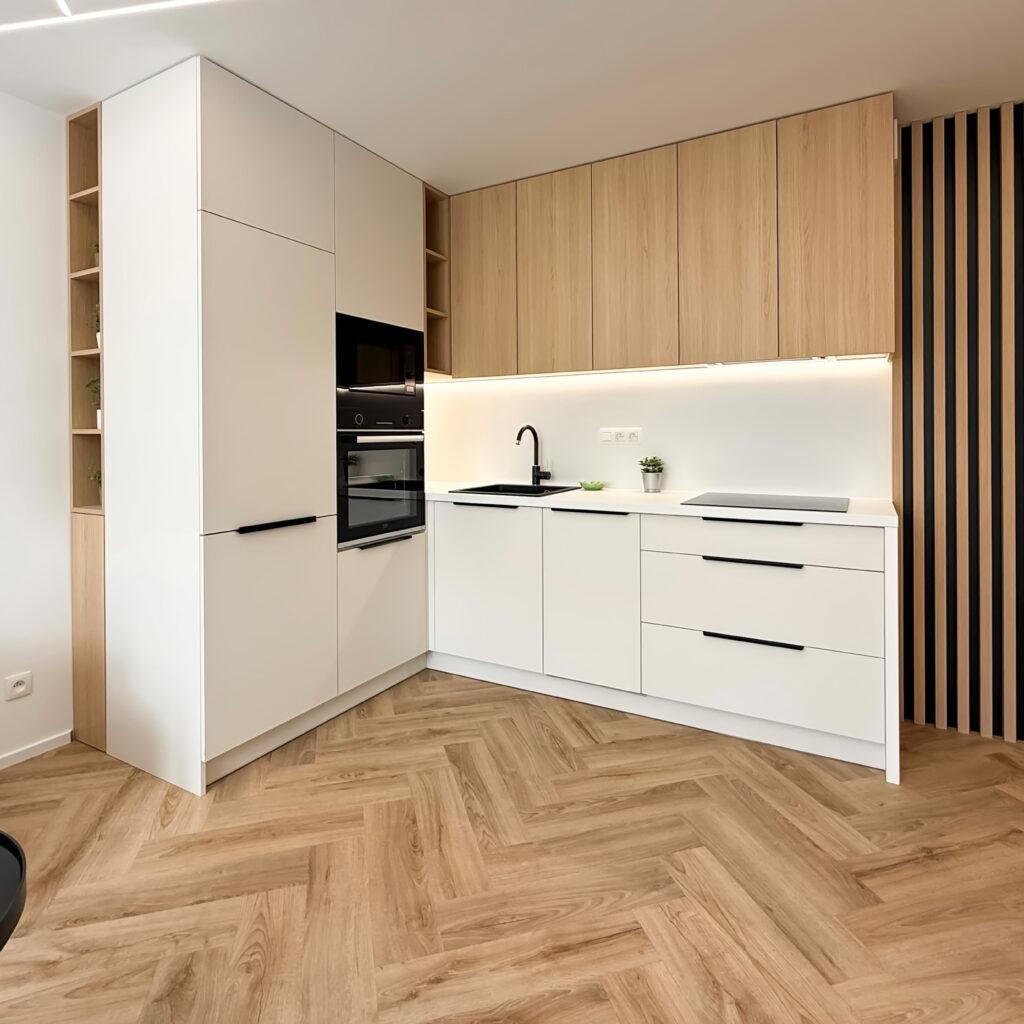 Dominantným prvkom obytného priestoru je kvalitná vinylová podlaha so vzorom rybej kosti, ktorá v celom priestore plynule nadväzuje na lamelové panely a nábytok vyrobený na mieru. Svetlo v tomto priestore neplní len praktickú funkciu, ale stáva sa kľúčovým architektonickým prvkom vďaka integrovaným LED líniám, ktoré jemne kopírujú dispozíciu a podčiarkujú dynamiku interiéru.