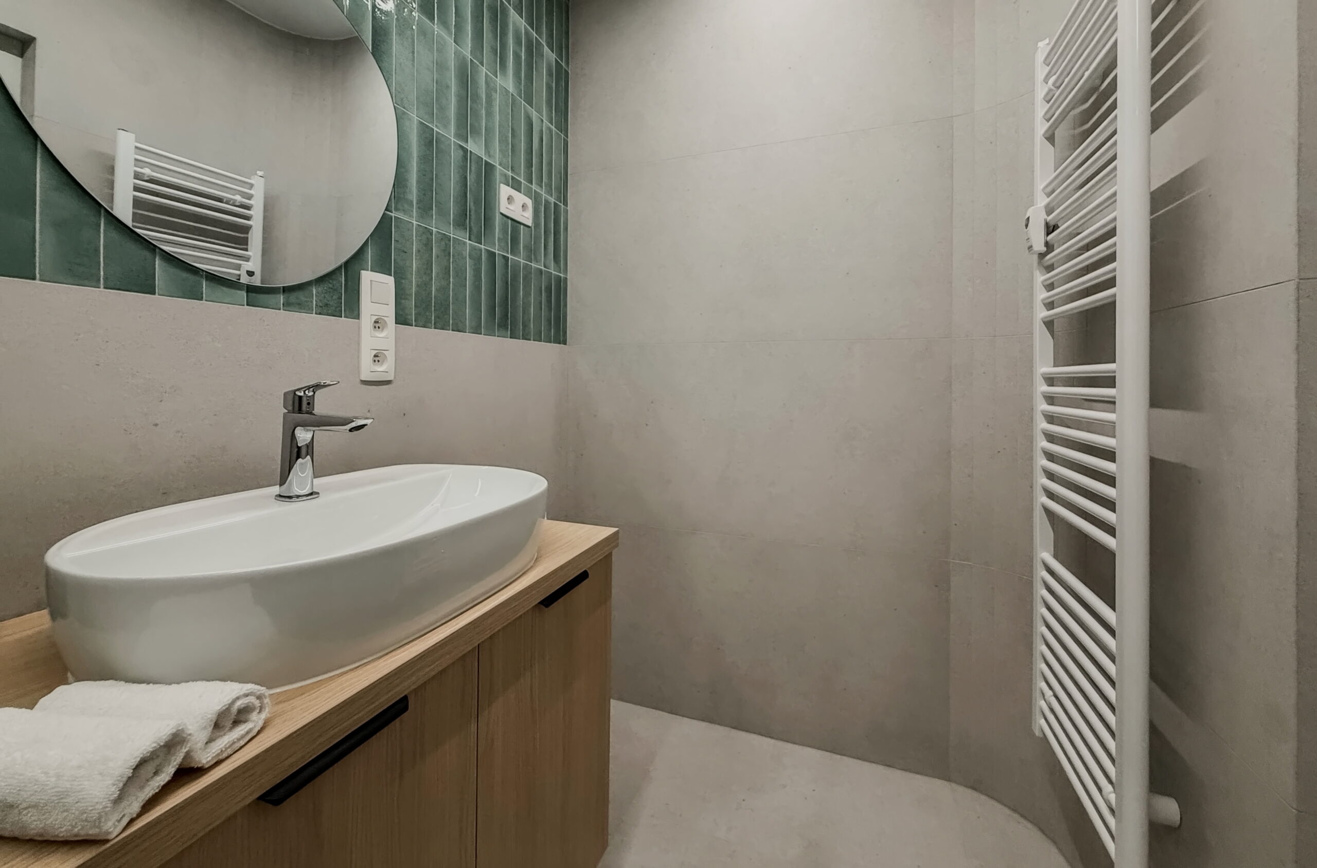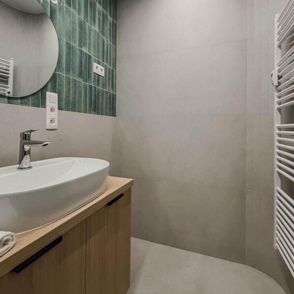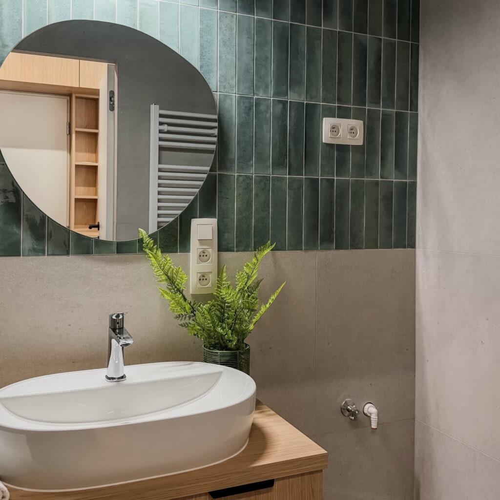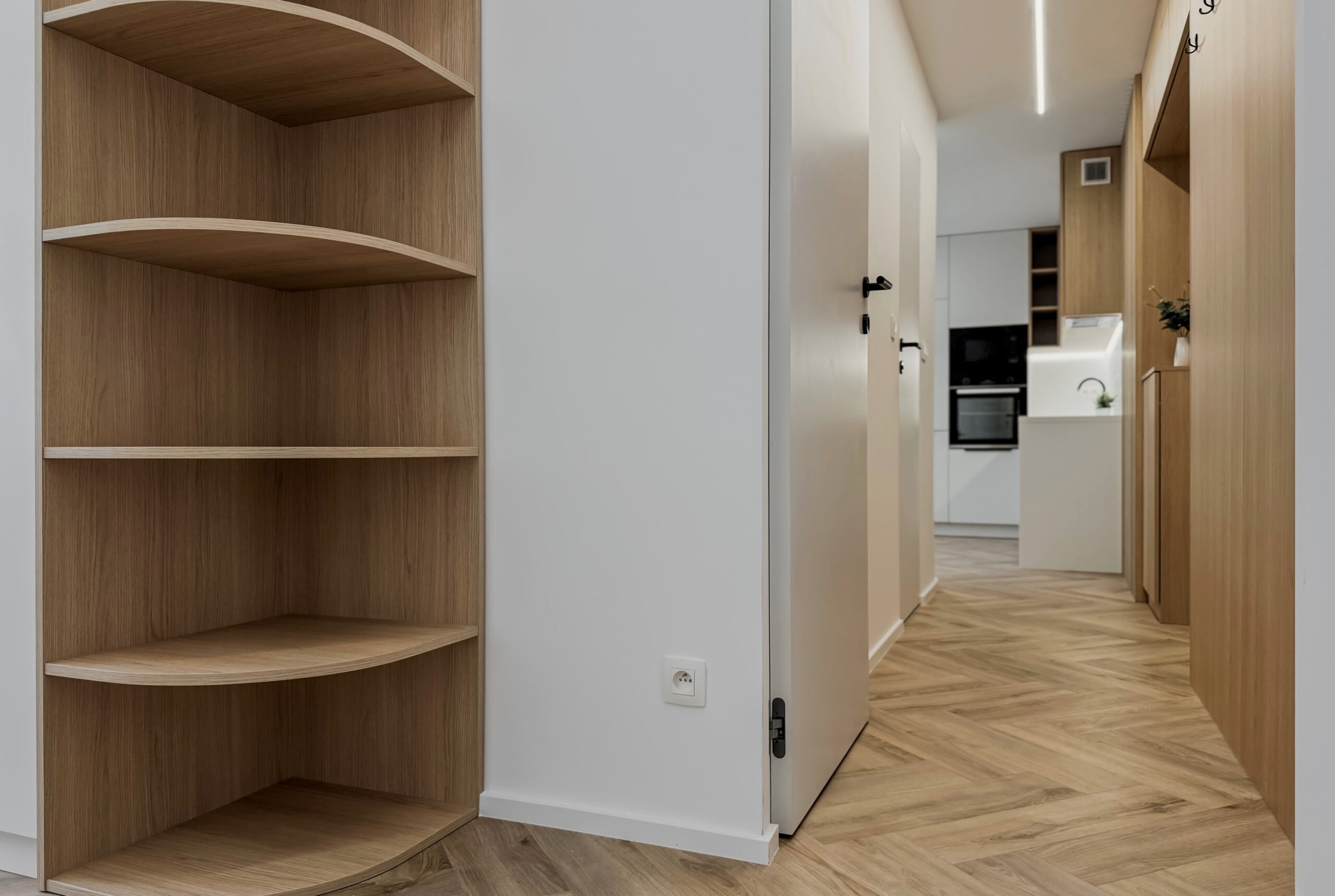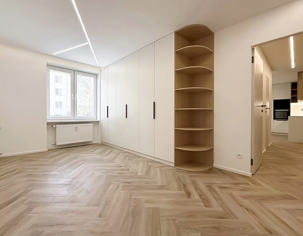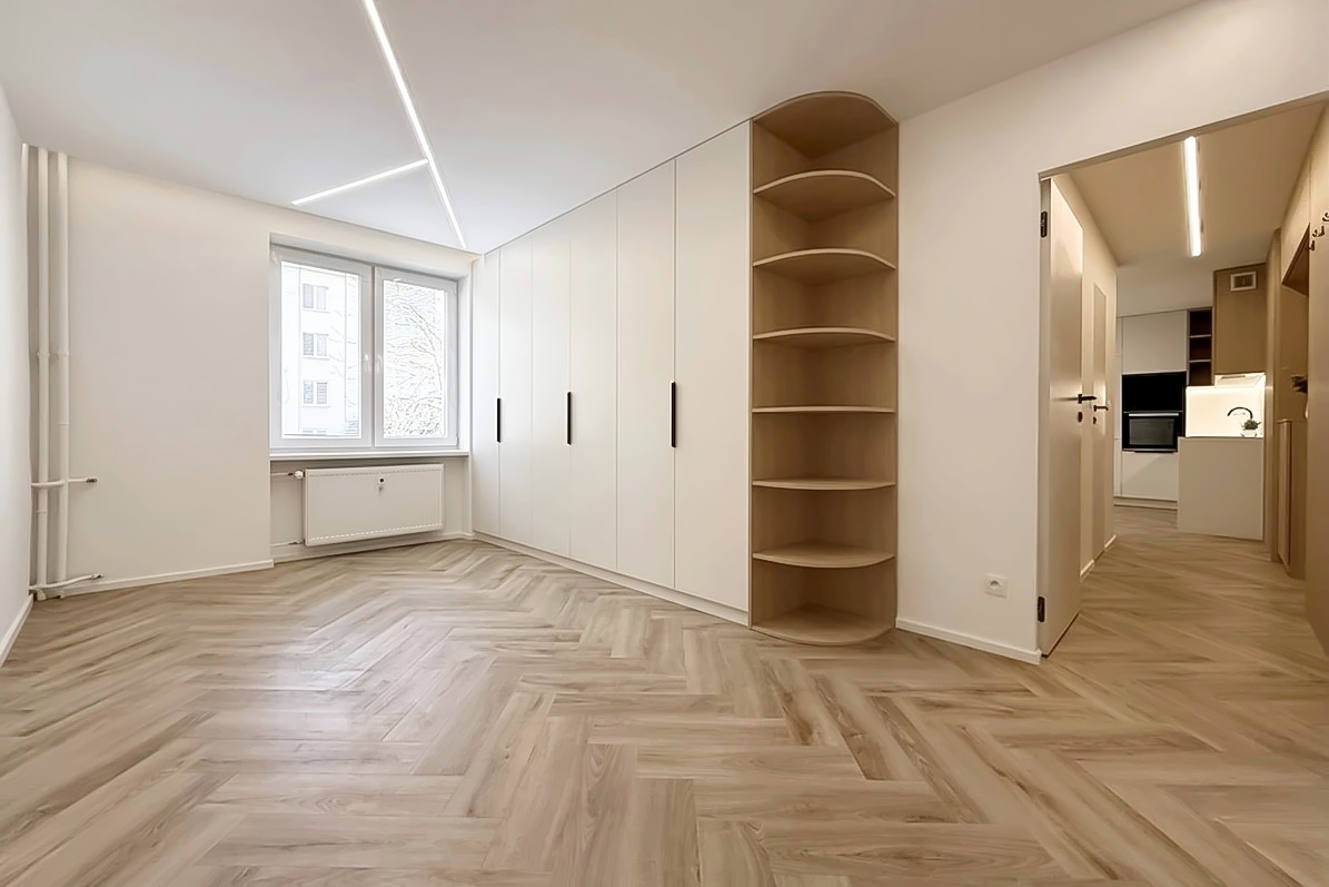 Šperkom celého interiéru je elegantná oblá stena, ktorá svojím tvarom prirodzene zjemňuje línie priestoru a dodáva bytu unikátnu dynamiku a vizuálnu exkluzivitu. Úložné priestory sú riešené nenápadne formou vstavaných skríň a dizajnových otvorených políc. Kúpeľňa vsádza na moderný obklad a minimalistickú sanitu, čím vytvára vizuálne čistý priestor. Byt je ideálnou voľbou pre niekoho, kto hľadá esteticky zladený domov bez potreby ďalších investícií.