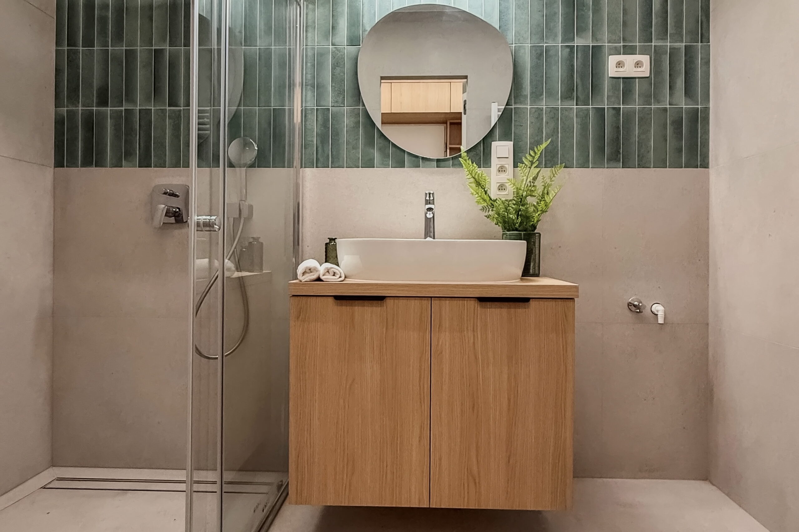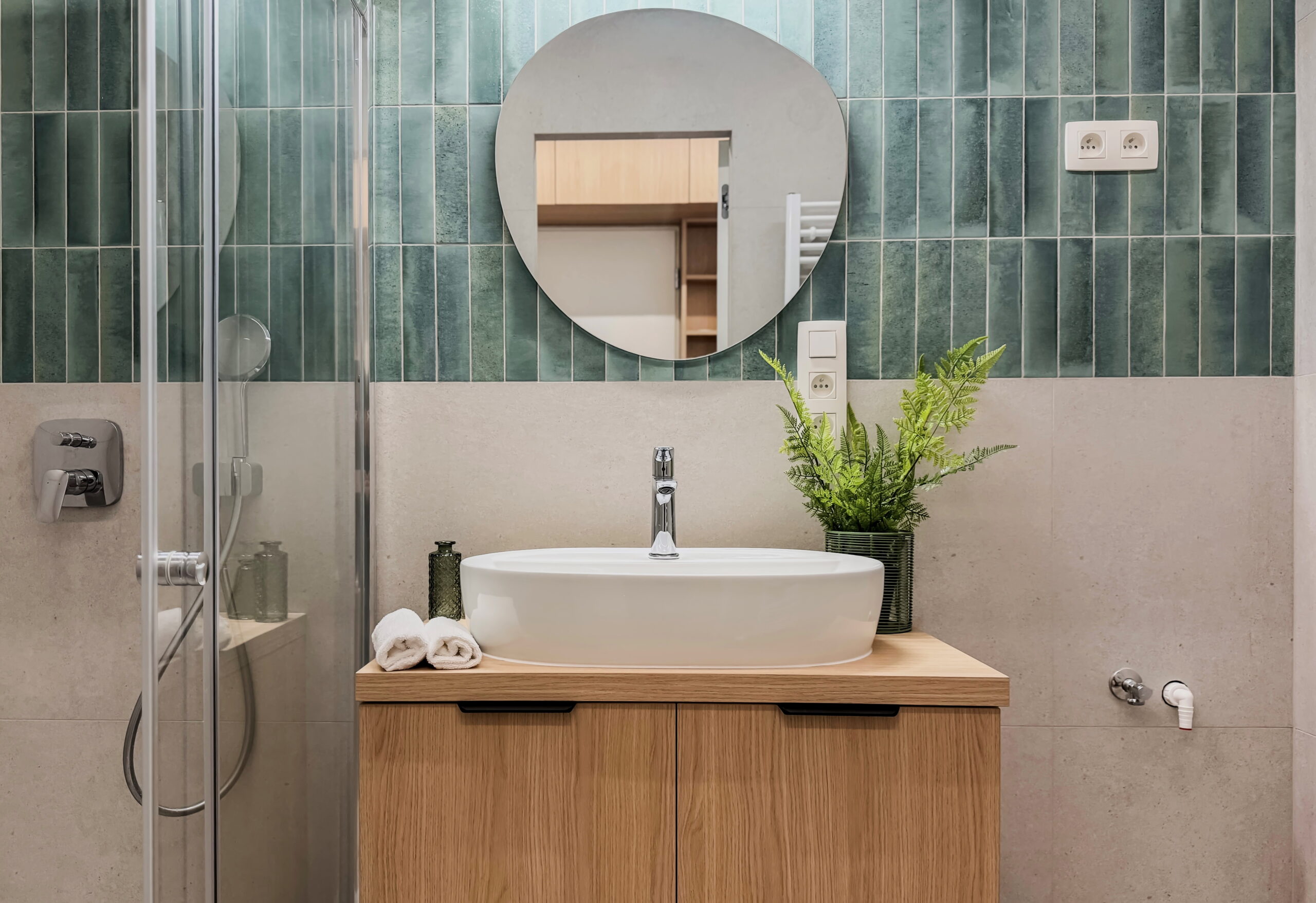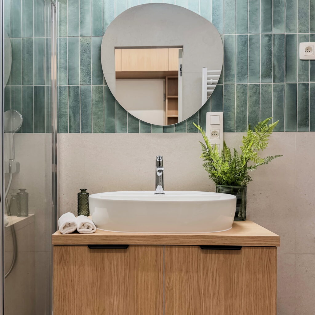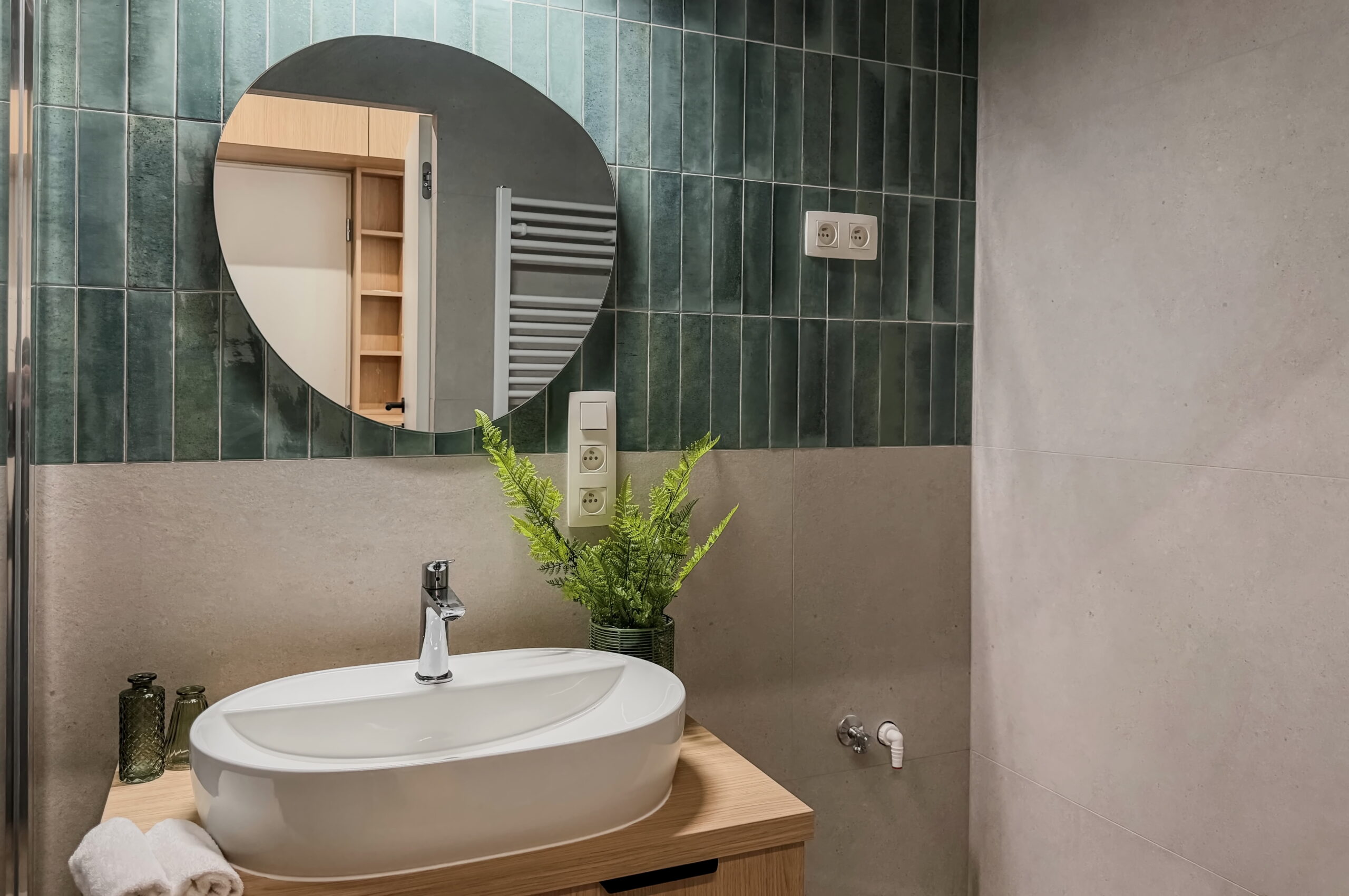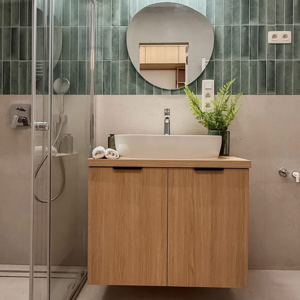 Šperkom celého interiéru je elegantná oblá stena, ktorá svojím tvarom prirodzene zjemňuje línie priestoru a dodáva bytu unikátnu dynamiku a vizuálnu exkluzivitu. Úložné priestory sú riešené nenápadne formou vstavaných skríň a dizajnových otvorených políc. Kúpeľňa vsádza na moderný obklad a minimalistickú sanitu, čím vytvára vizuálne čistý priestor. Byt je ideálnou voľbou pre niekoho, kto hľadá esteticky zladený domov bez potreby ďalších investícií.